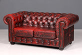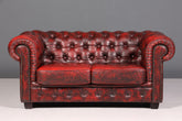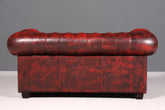Dieses authentische englische Chesterfield Sofa verkörpert zeitlose Eleganz und handwerkliche Meisterschaft. Das 2-Sitzer Modell besticht durch sein charakteristisches Design mit geknöpfter Polsterung und markanten Messingnägeln, bezogen in edlem Oxblood-Leder, das mit den Jahren an Patina und Charakter gewinnt. Die klassischen Rollen und die großzügige Sitzfläche bieten sowohl visuellen als auch physischen Komfort. Ein Stück britischer Möbelkultur, das jeden Wohnraum mit Raffinesse und Persönlichkeit bereichert – ideal für Sammler und Liebhaber authentischer Vintage-Möbel.