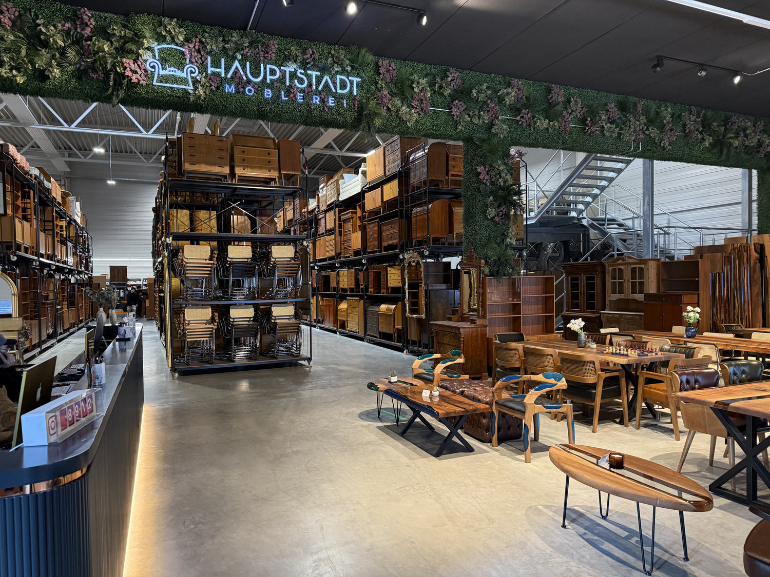 Einblick in unseren 4.000 m² großen Möbel-Showroom in Berlin-Lichtenberg mit professionell aufbereiteten Vintage-Möbeln und ausgewählten Designstücken.
